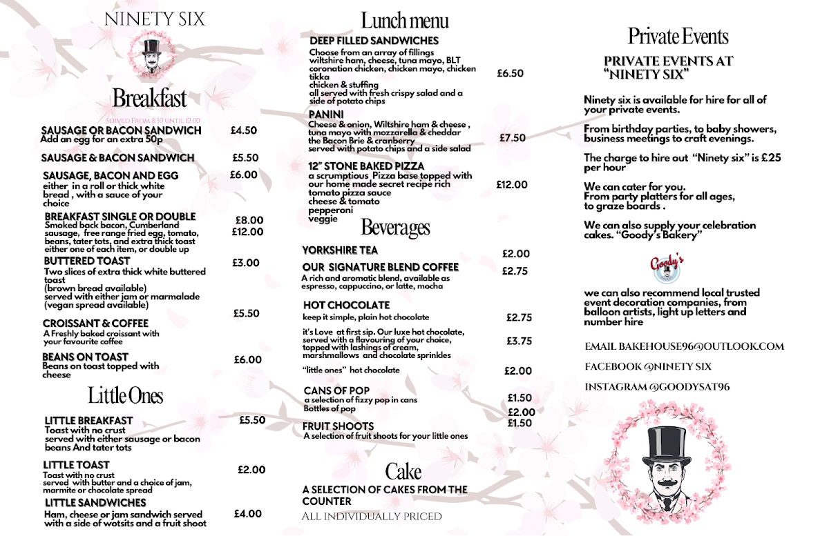 The menu at Ninety six offers a range of options suitable for breakfast, lunch, and light snacks throughout the day. The breakfast selection includes items such as sausage or bacon sandwiches, combinations with egg served in a roll or thick white bread, and a full breakfast option featuring smoked back bacon, Cumberland sausage, free-range fried egg, tomato, beans, tater tots, and toast. Buttered extra-thick white toast is also available.